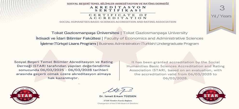 Our Department of Business Administration has been granted accreditation for 3 years until 2028 as a result of the evaluation conducted by the Social Humanities Basic Sciences Accreditation and Rating Association (STAR). We would like to thank our valuable faculty members and students for their contributions to the accreditation process.