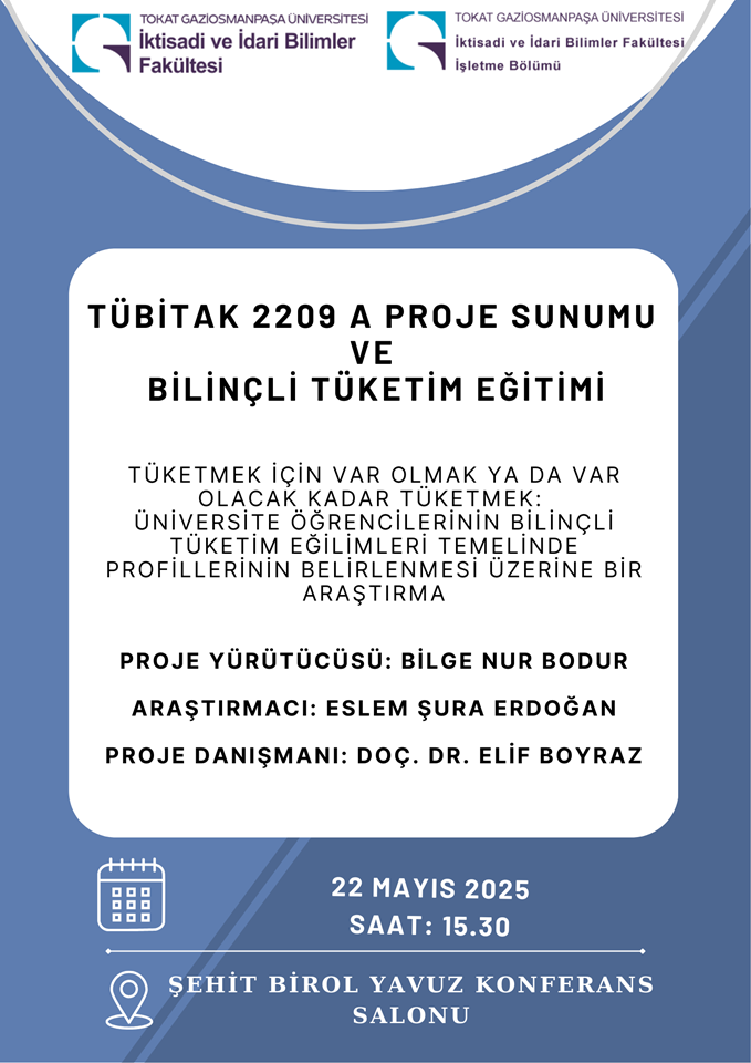 22 Mayıs Perşembe günü saat 15.30'da İİBF Şehit Birol YAVUZ Konferans Salonu'nda "TÜBİTAK 2209 A Proje Sunumu ve Bilinçli Tüketim Eğitimi" yapılacaktır. "Tüketmek İçin Var olmak Ya da Var Olacak Kadar Tüketmek: Üniversite Öğrencilerinin Bilinçli Tüketim Eğilimleri Temelinde Profillerinin Belirlenmesi Üzerine Bir Araştırma" isimli TÜBİTAK projesi kapsamında proje yürütücüsü Bilge Nur Bodur, araştırmacı Eslem Şura Erdoğan ve proje danışmanı Doç. Dr. Elif Boyraz projeleri hakkında bilgiler vereceklerdir. Herkesi etkinliğimize bekliyoruz.