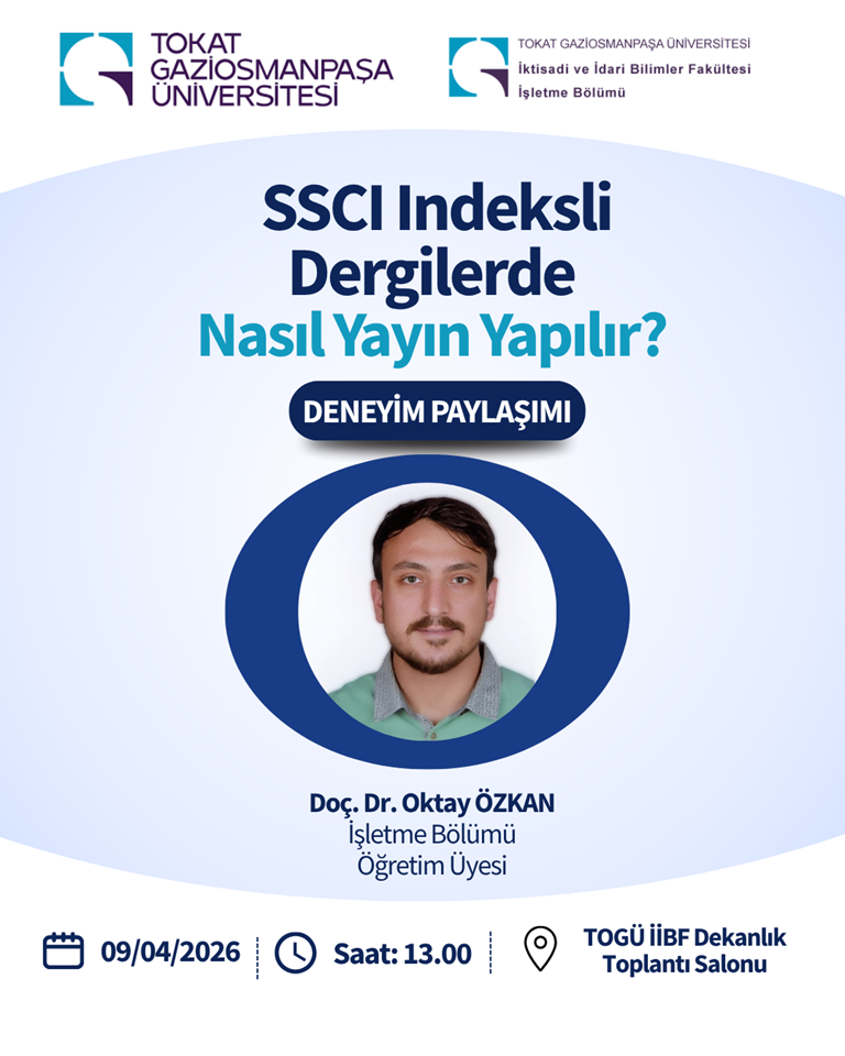 İşletme Bölümü tarafından düzenlenen "SSCI İndeksli Dergilerde Nasıl Yayın Yapılır? - Deneyim Paylaşımı" başlıklı etkinlik, 9 Nisan 2026 tarihinde İİBF Dekanlık Toplantı Salonu’nda gerçekleştirildi.